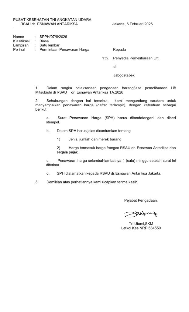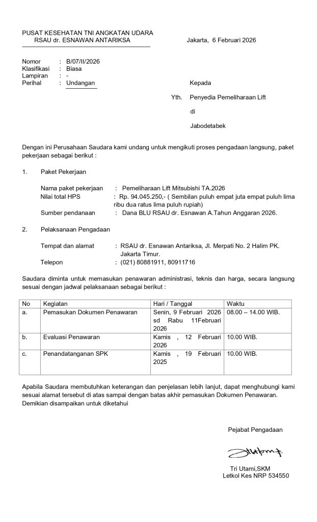 pengadaan barang/jasa pemeliharaan Lift Mitsubishi di RSAU dr. Esnawan Antariksa TA.2026